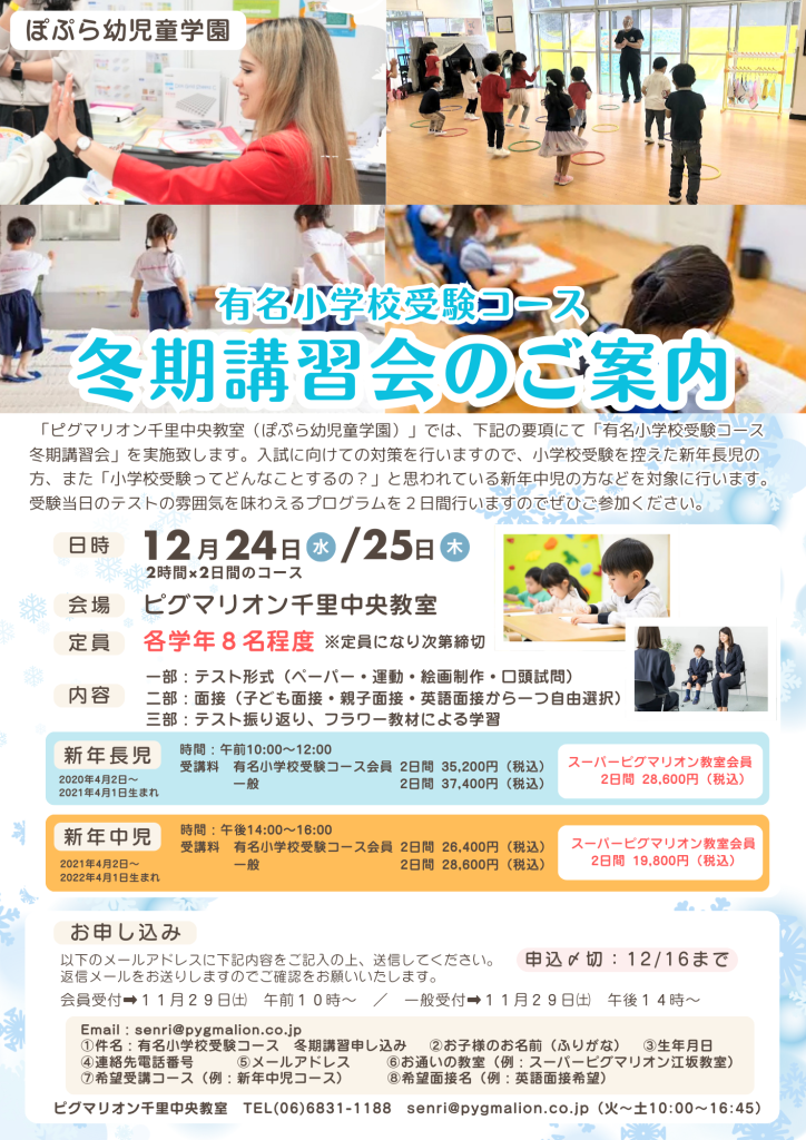 「ピグマリオン千里中央教室(ぽぷら幼児童学園)」では、下記の要項にて「有名小学校受験コース